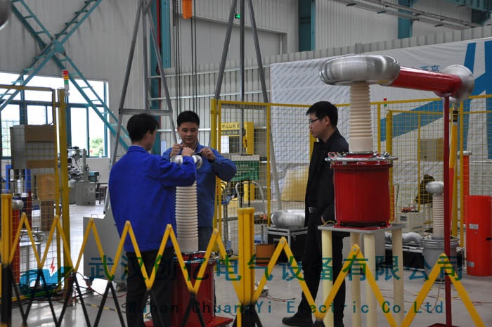 我司技術人員已經提前將設備架設好,其中包括10/100和15/100兩臺變壓器串級,保護電阻以及控制臺設備。客戶抵達我司后,直接前往廠房進行驗收工作。