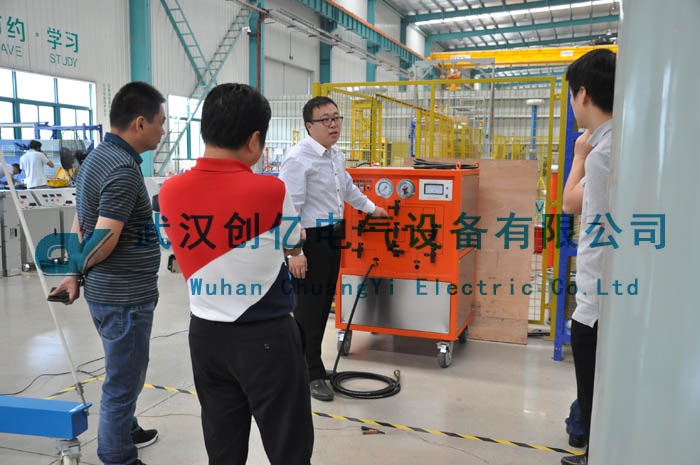 隨后客戶前往我司廠房對現(xiàn)有的SF6試驗設(shè)備樣品進(jìn)行詳細(xì)的了解考察。由我司的技術(shù)人員詳細(xì)講解了SF6氣體回收裝置的試驗原理、操作以及技術(shù)參數(shù)等。