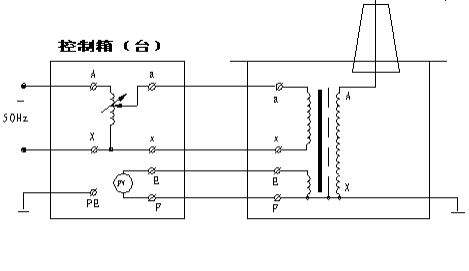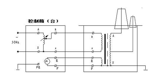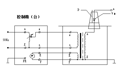 氣體式試驗變壓器為單相變壓器,聯結組號Ⅰ.Ⅰ.采用工頻220V380V控制箱,經自耦調壓器,0~200V0~400V輸出至變壓器低壓繞組輸入端,根據電磁感應原理,在試驗變壓器高壓繞組可獲得試驗所需的高壓電壓。