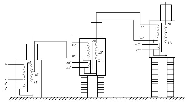 串級氣體式試驗變壓器有很大的優越性,三臺試驗變壓器串級連接可獲得更高的電壓,因為整個試驗裝置由幾臺單臺試驗變壓器組成,單臺試驗變壓器容量小、電壓低、重量輕,便于運輸和安裝。它既然可串接成高出幾倍的單臺試驗變壓器輸出電壓組合使用,又可分開成幾套單臺試驗變壓器單獨使用。整套裝置投資小,經濟實惠。圖5中,在第一級和第二級的每個單元試驗變壓器中都有一個勵磁繞組A1、C1A2、C2。在串級試驗變器基本原理圖中,低壓電源加在試驗變壓器I的初級繞組a1x1上,單臺試驗變壓、、的輸出電壓都是V。勵磁繞組A1、C1給第二級試驗變壓器的初級繞組供電;第二級試驗變壓器的勵磁繞組A2、C2給第三級試驗變壓器的初級繞組供電。第二級試驗變壓器和第三級試驗變壓器的箱體分別處在對地為1V2V的高電位上,所以箱體對地是絕緣的,試驗變壓器I的箱體是接地的。這樣第一級、第二級、第三試驗變壓器對地的額定輸出電壓分別為1V、2V3V;其額定容量分別為3P、2P、1P