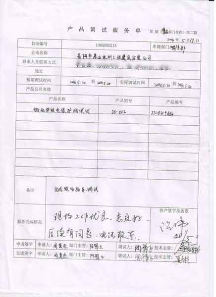 2014-05-20  岳陽市君山水利工程建筑安裝公司進行調試服務,調試產品:CYJB-802 微機型繼電保護測試儀