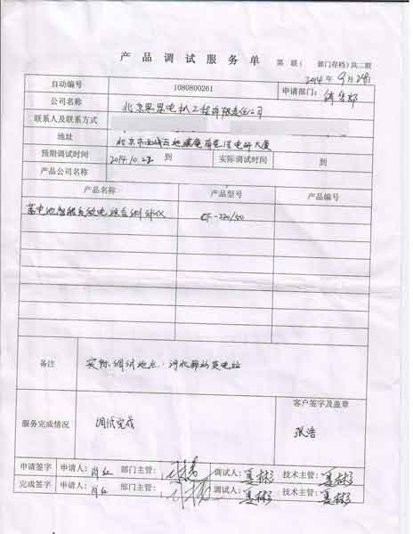 2014-10-31  北京思恩機(jī)電工程有限責(zé)任公司進(jìn)行調(diào)試服務(wù),調(diào)試產(chǎn)品:CYCF-220/50蓄電池智能充放電綜合測(cè)試儀