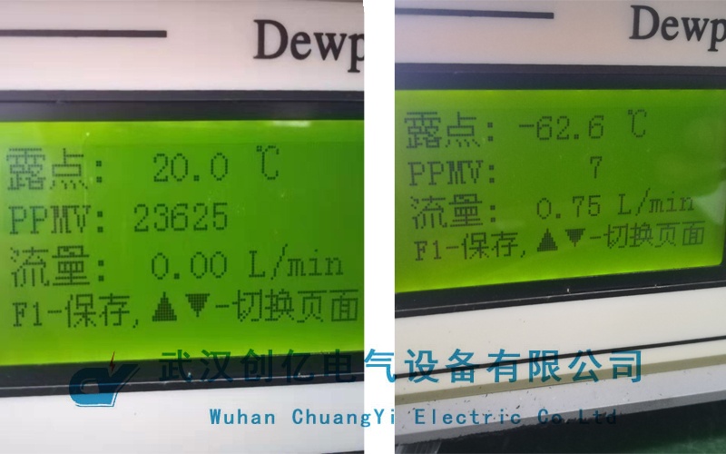 CYWS-242 SF6微水測量儀進行檢測時,先用高純氮清洗測量管道,通過調節測量管道上的針型閥,流量調節到0.75L/min,測出數據:7ppmv;后續還對SF6新氣微水值也做了同樣測量,得出結果為11ppmv。兩項試驗均符合標準。